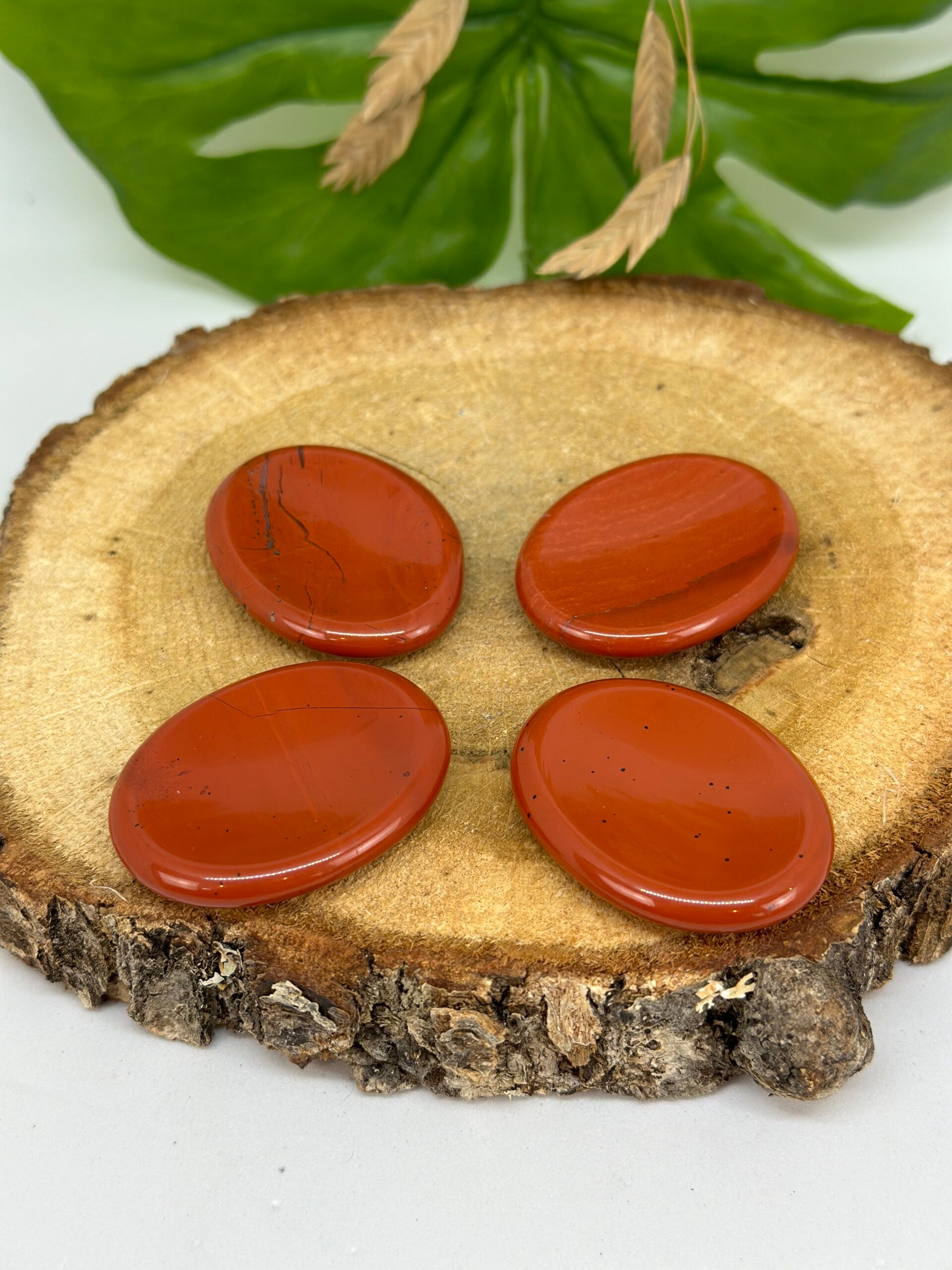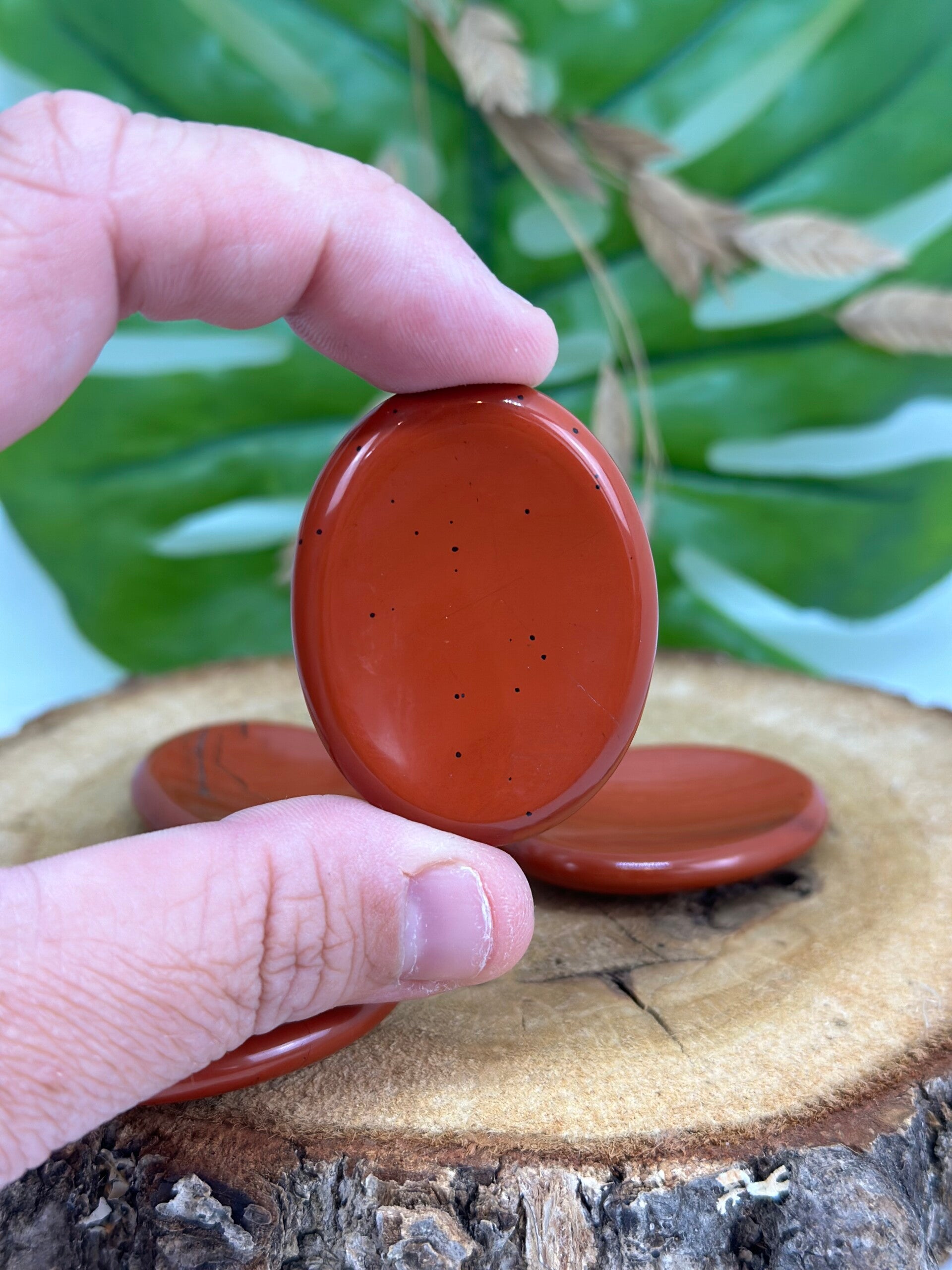 Ovalen worrystone van rode Jaspis met uitsparing om je duim in te leggen, 4,5 centimeter lang. Willekeurig gekozen.
