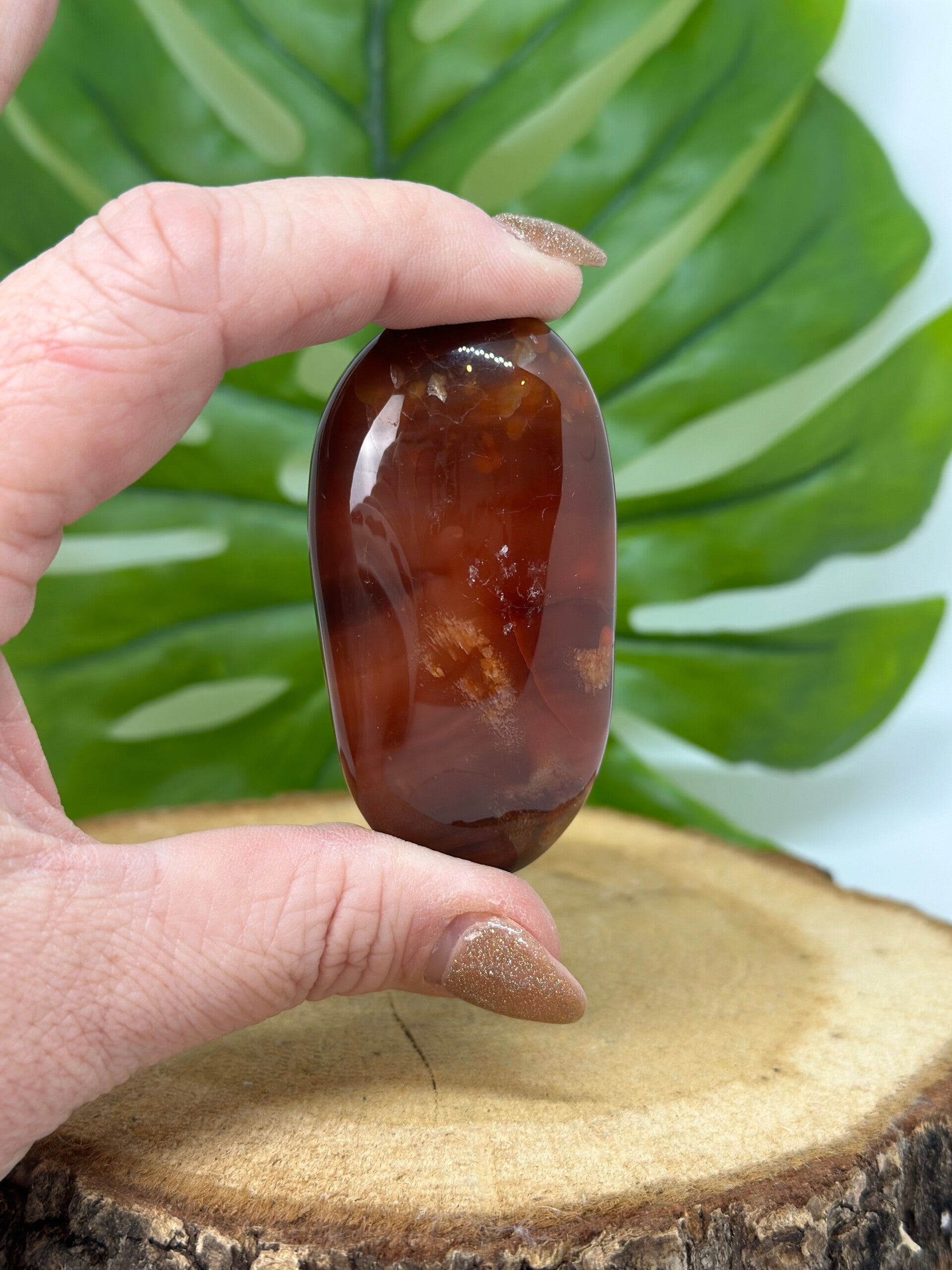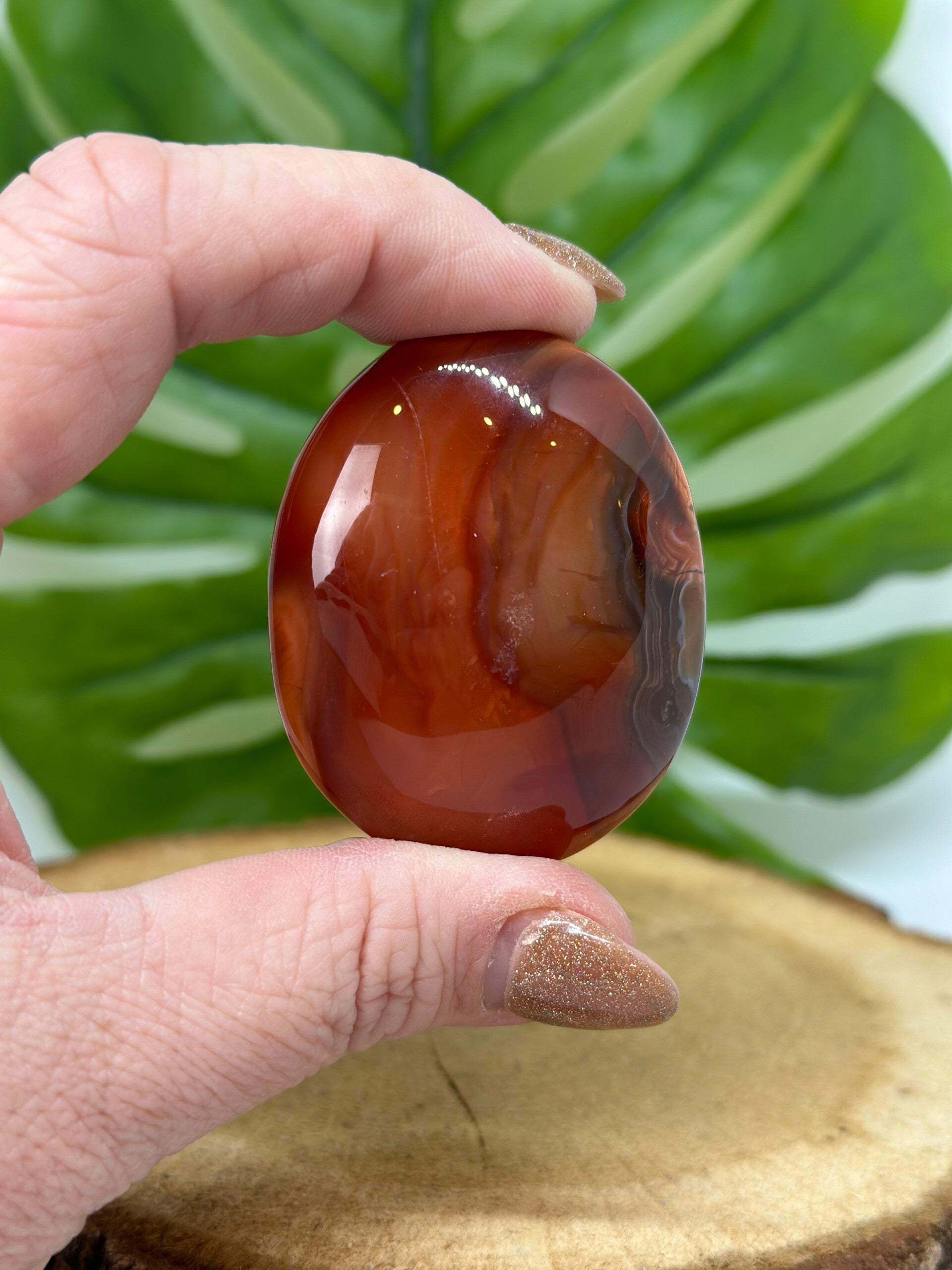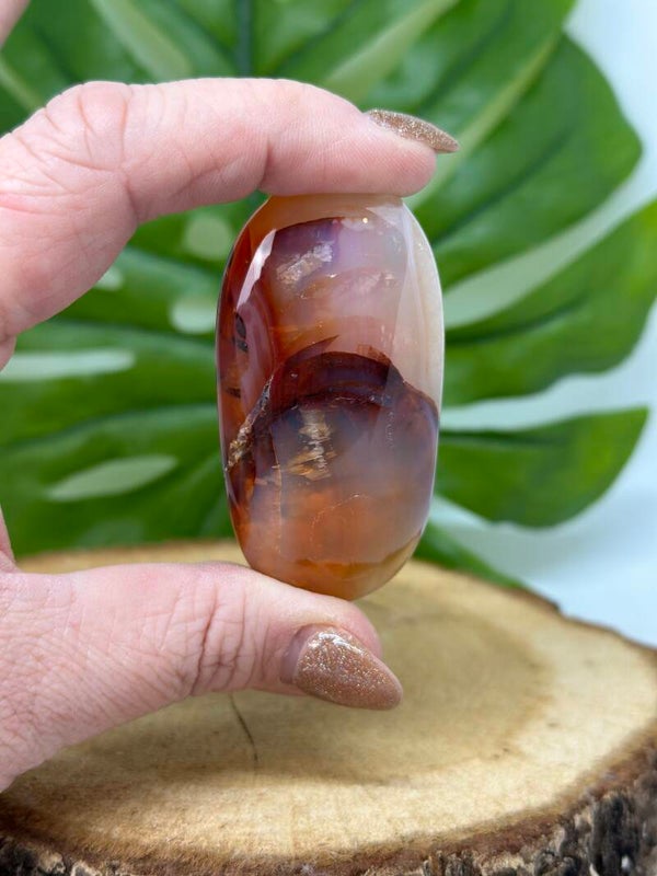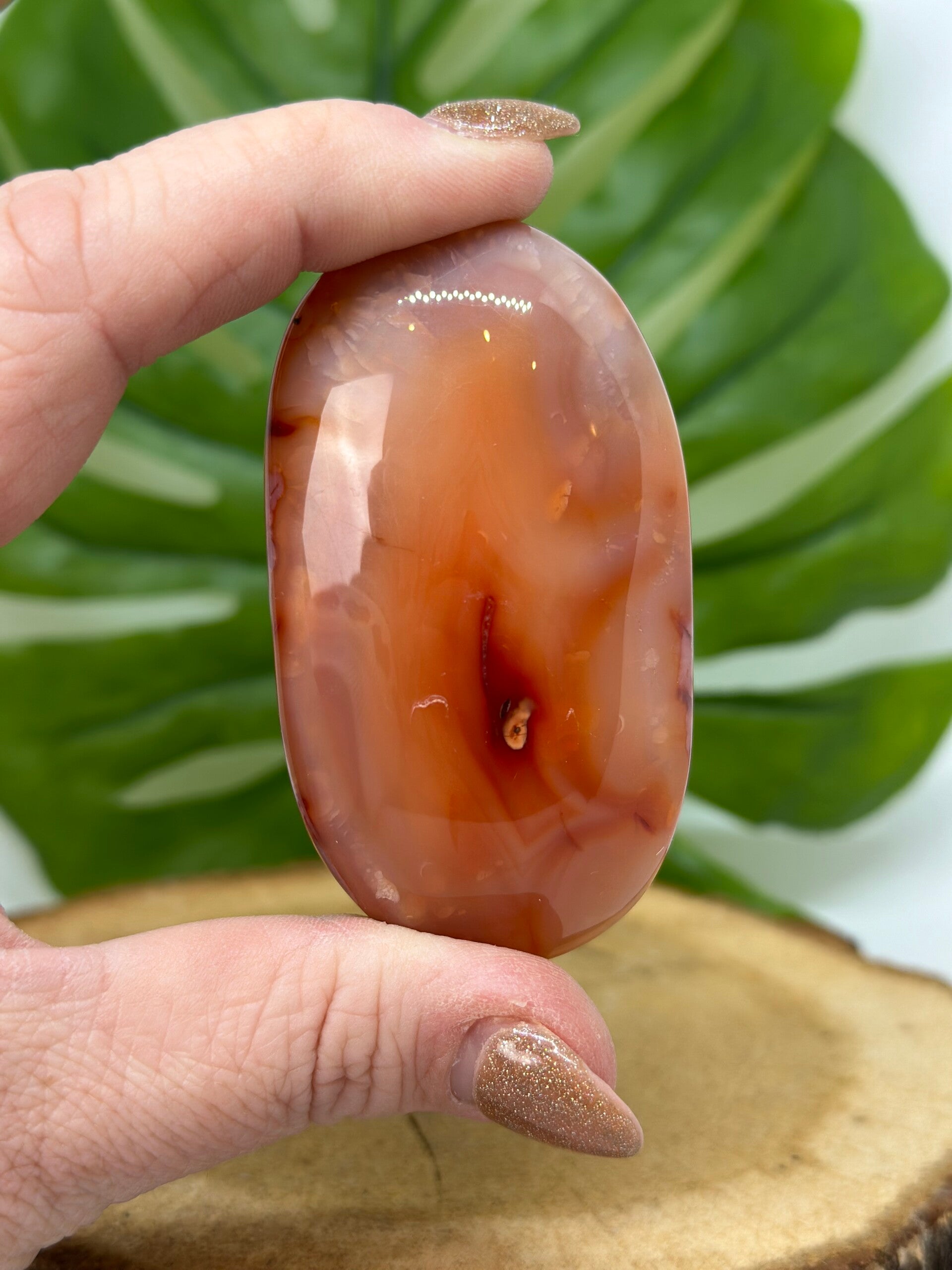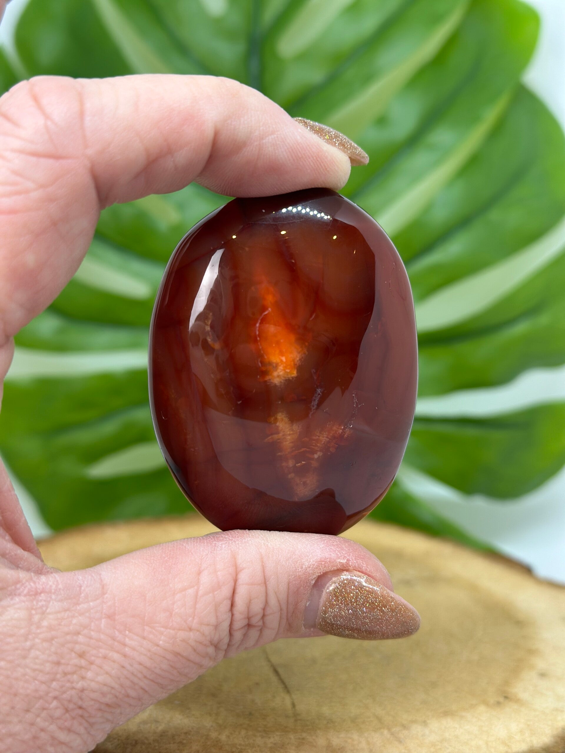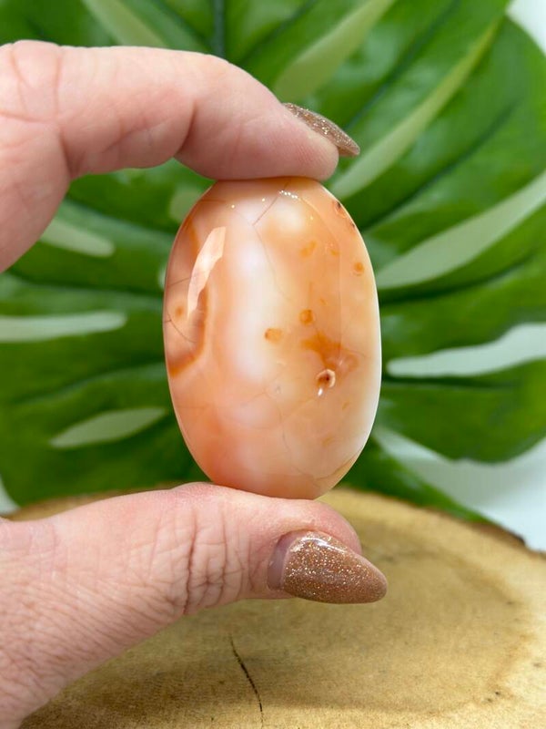 Palmstenen van Carneool. Verschillend van gewicht en grootte, gemiddeld 60 gram en 5,5 centimeter. Willekeurig gekozen maar voorkeur voor foto in opmerkingen mag.