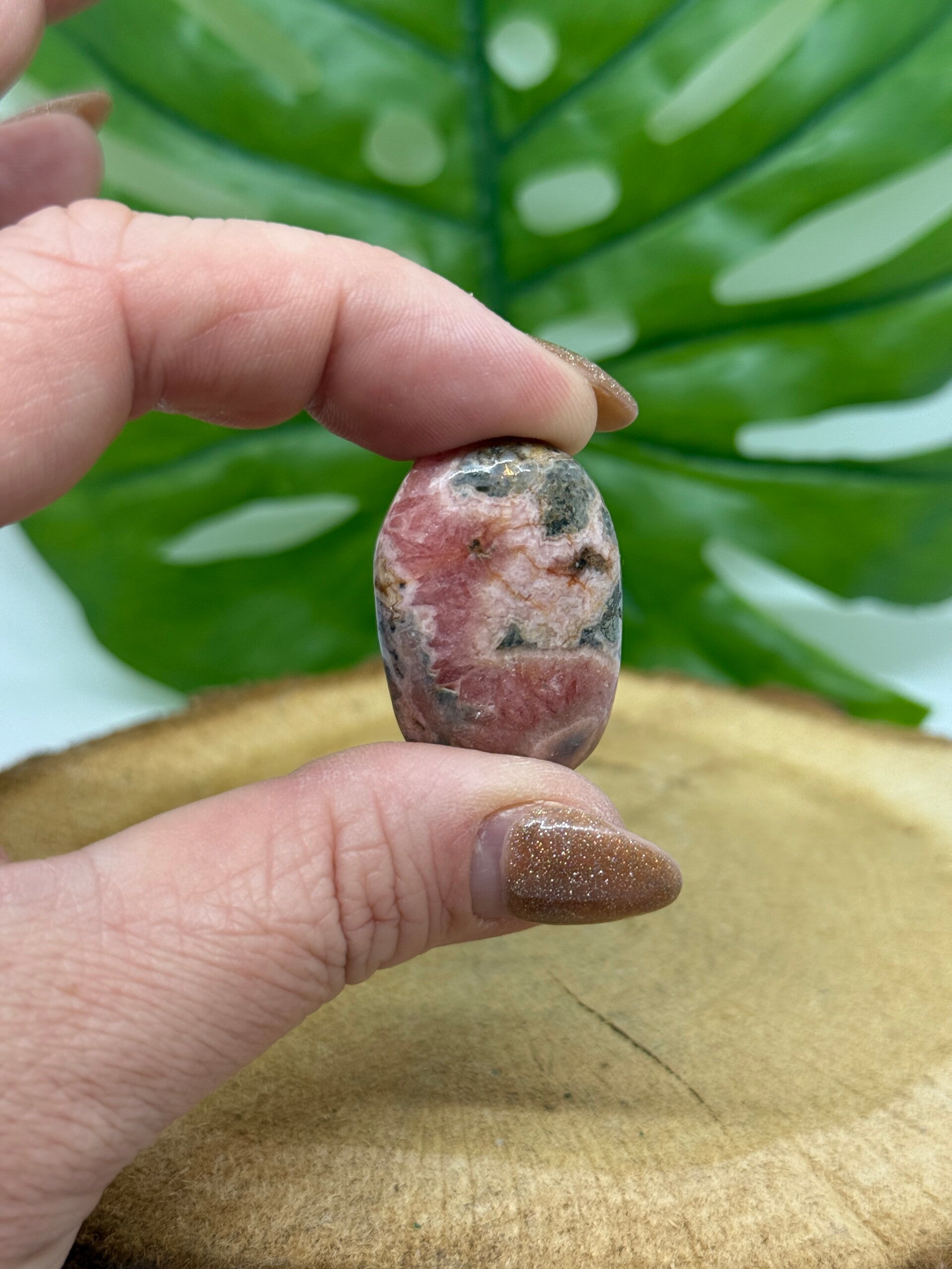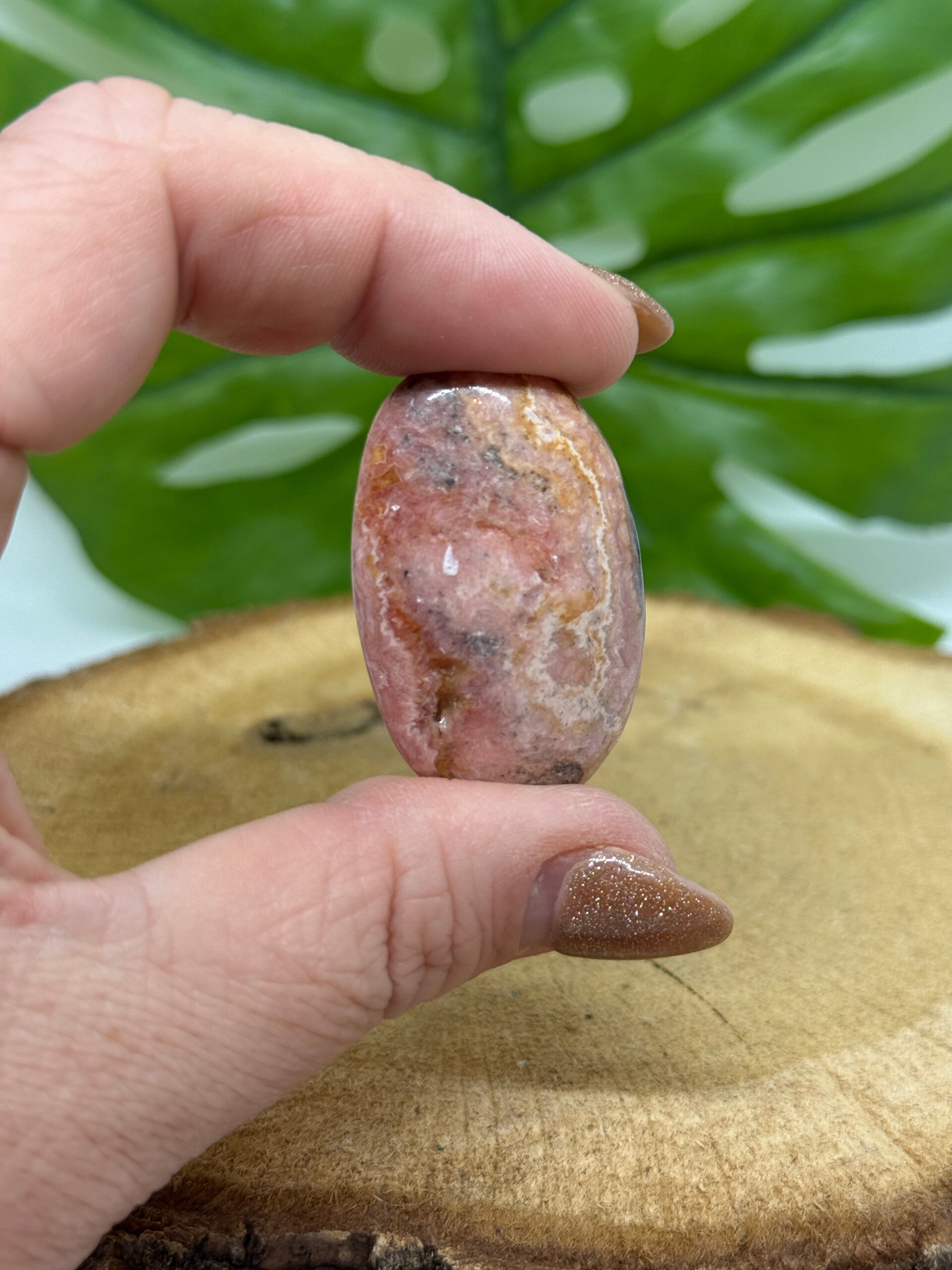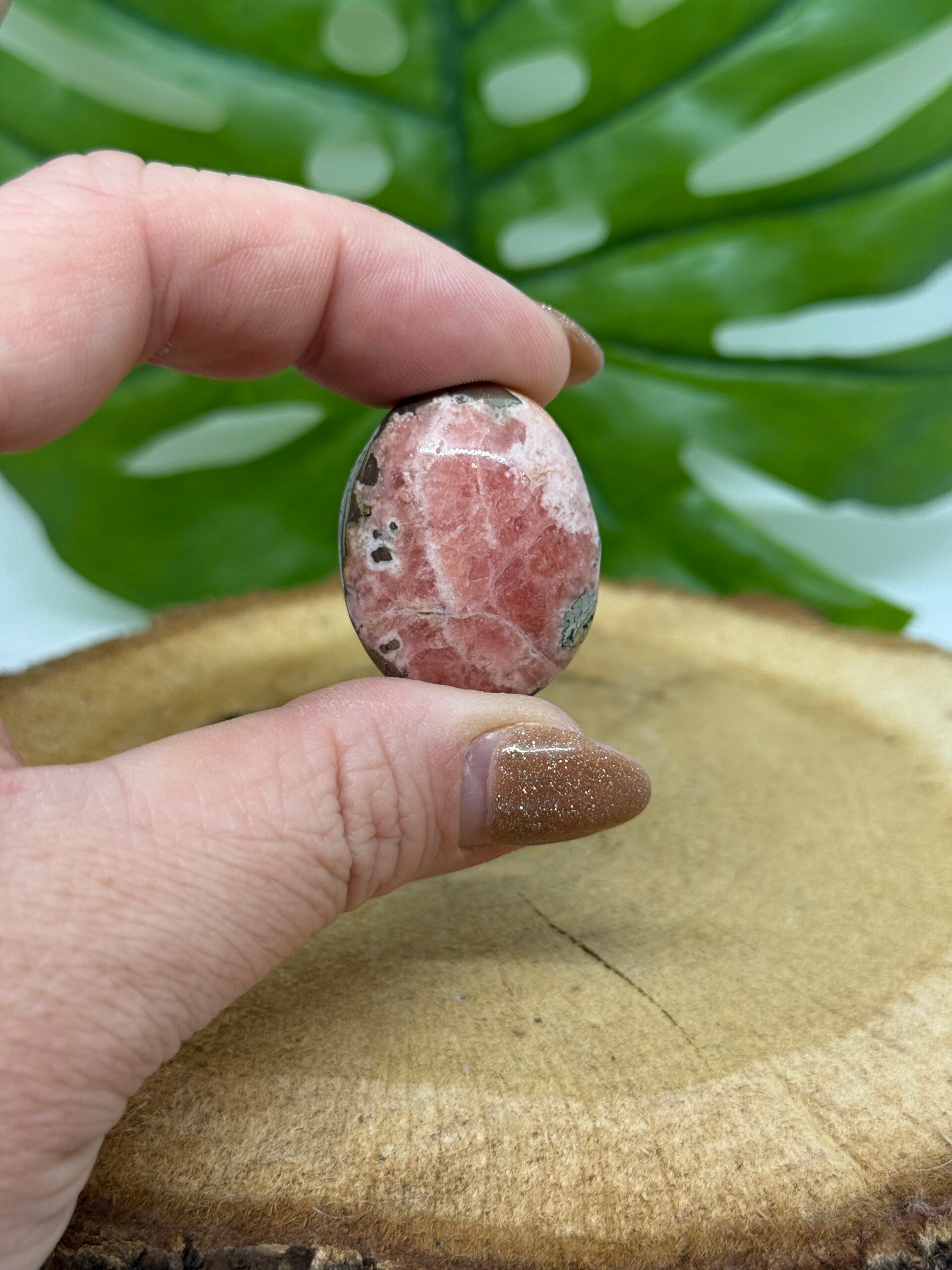 Rhodochrosiet palmsteen met Pyriet inclusies. ongeveer 4 centimeter hoog en 24 gram. Willekeurig gekozen tenzij fotonummer doorgegeven in reacties.