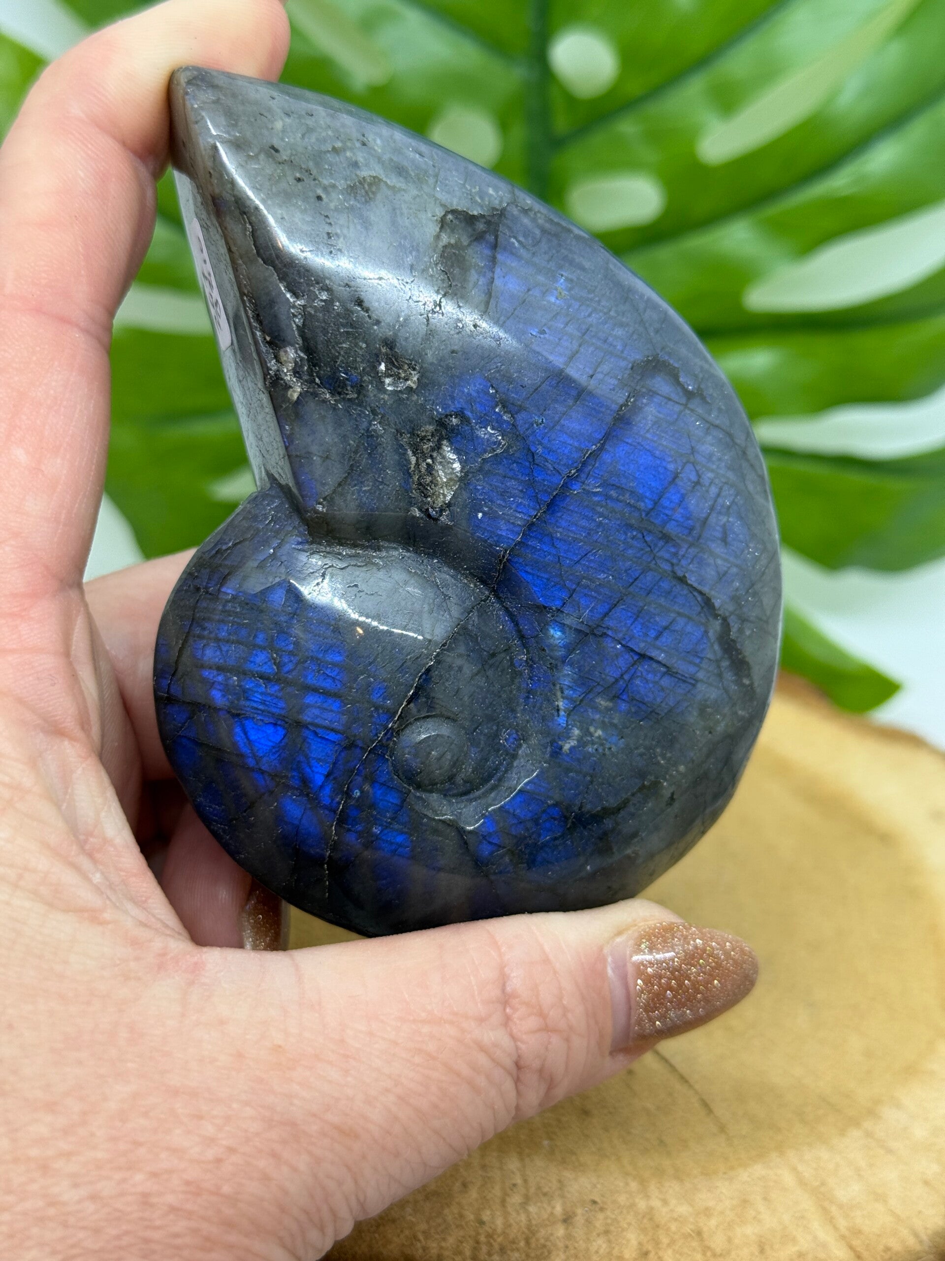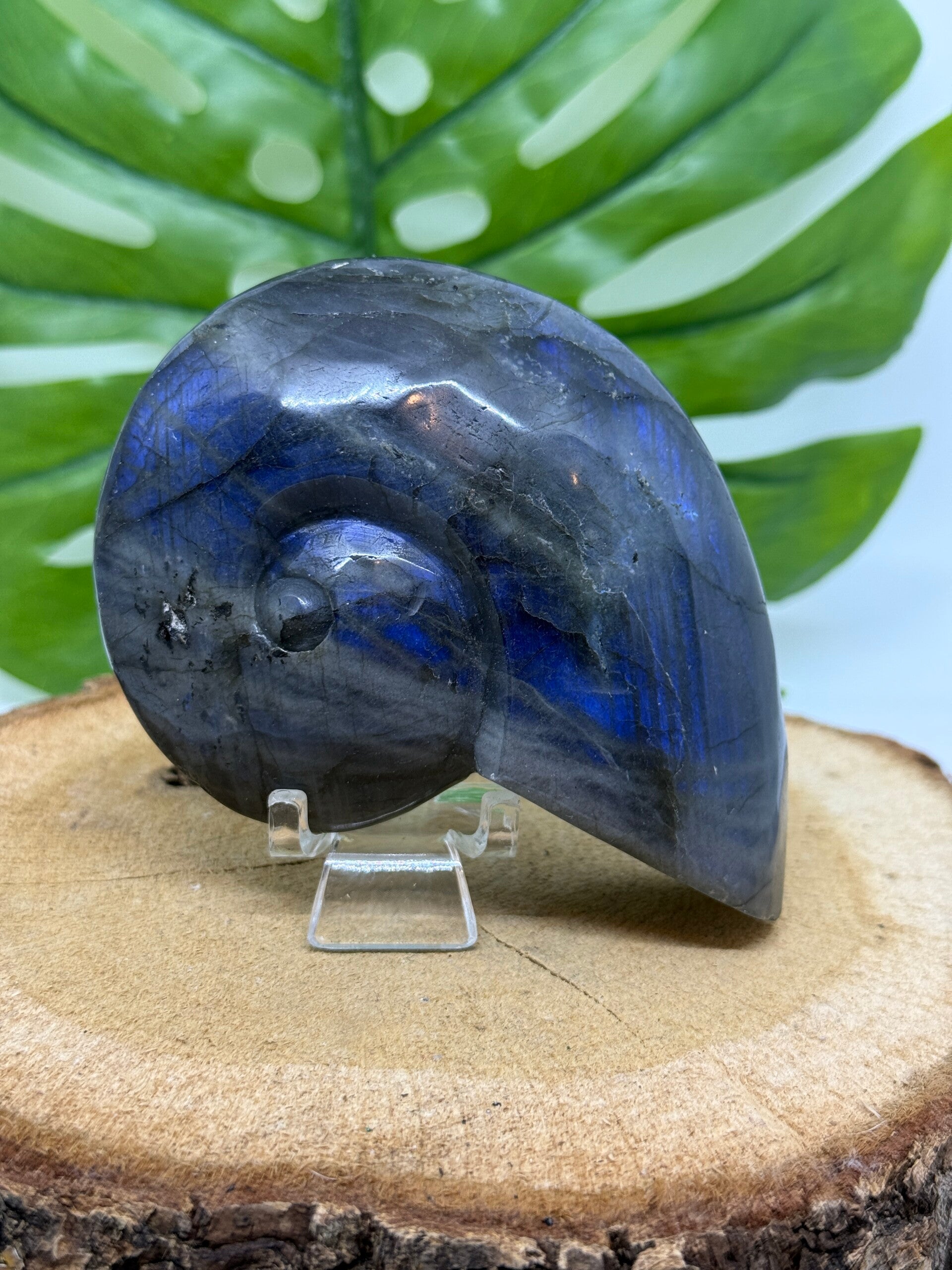 Schelp van Labradoriet met flash. 10 centimeter breed en 247 gram. Je ontvangt het item van de foto.