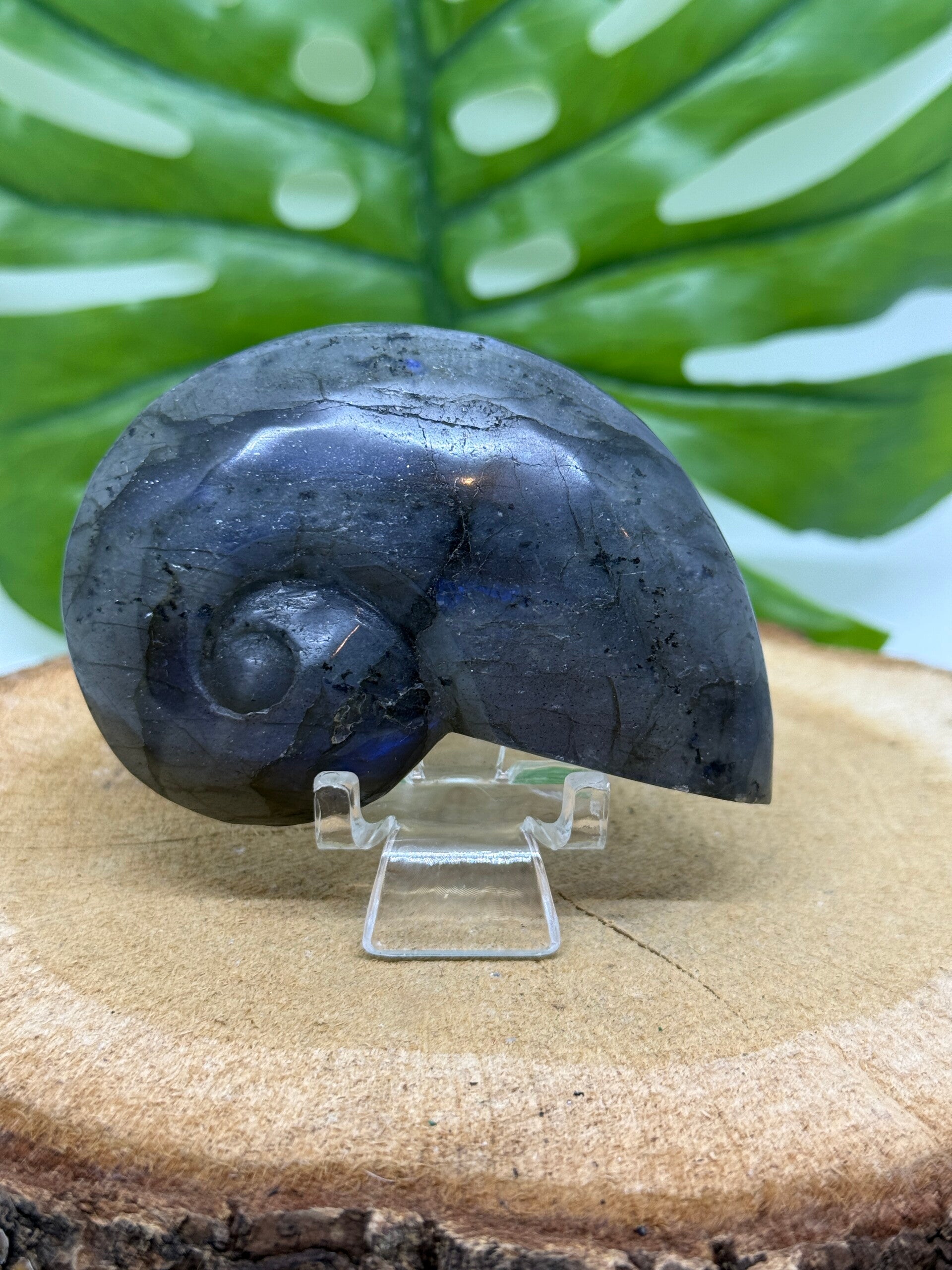 Schelp van Labradoriet met flash. 7,8 centimeter breed en 113 gram. Je ontvangt het item van de foto.