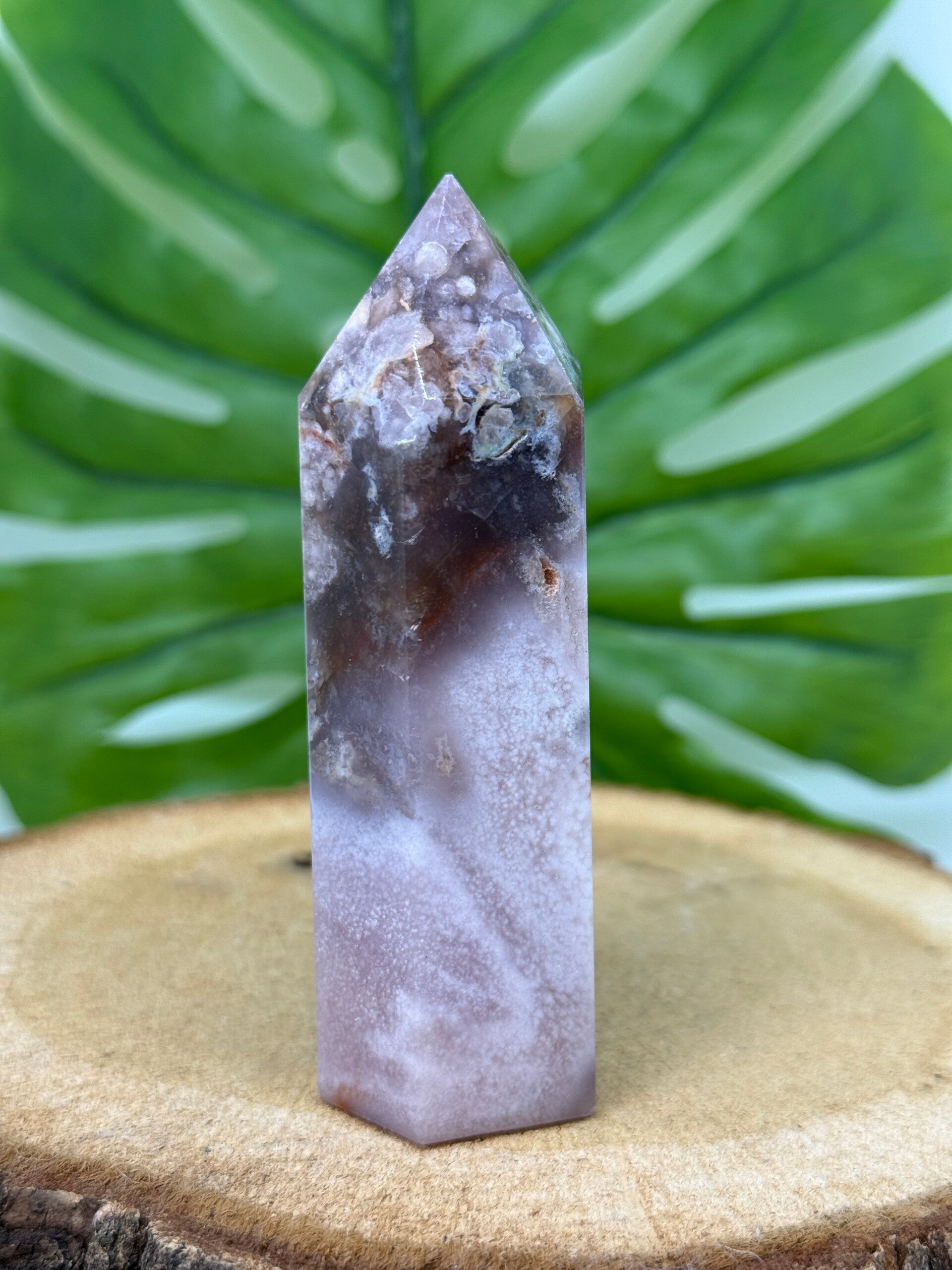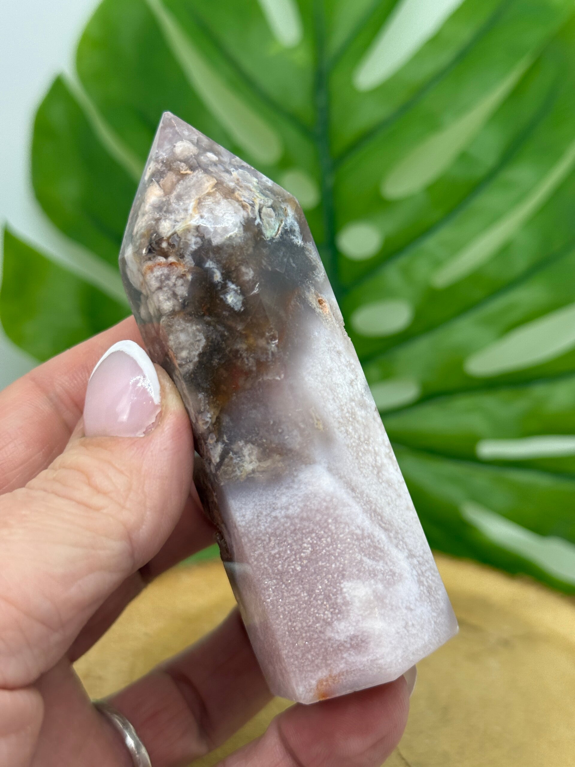 Punt van Bloemagaat met Roze Amethist. 9 centimeter hoog en 124 gram. Je ontvangt de punt van de foto.