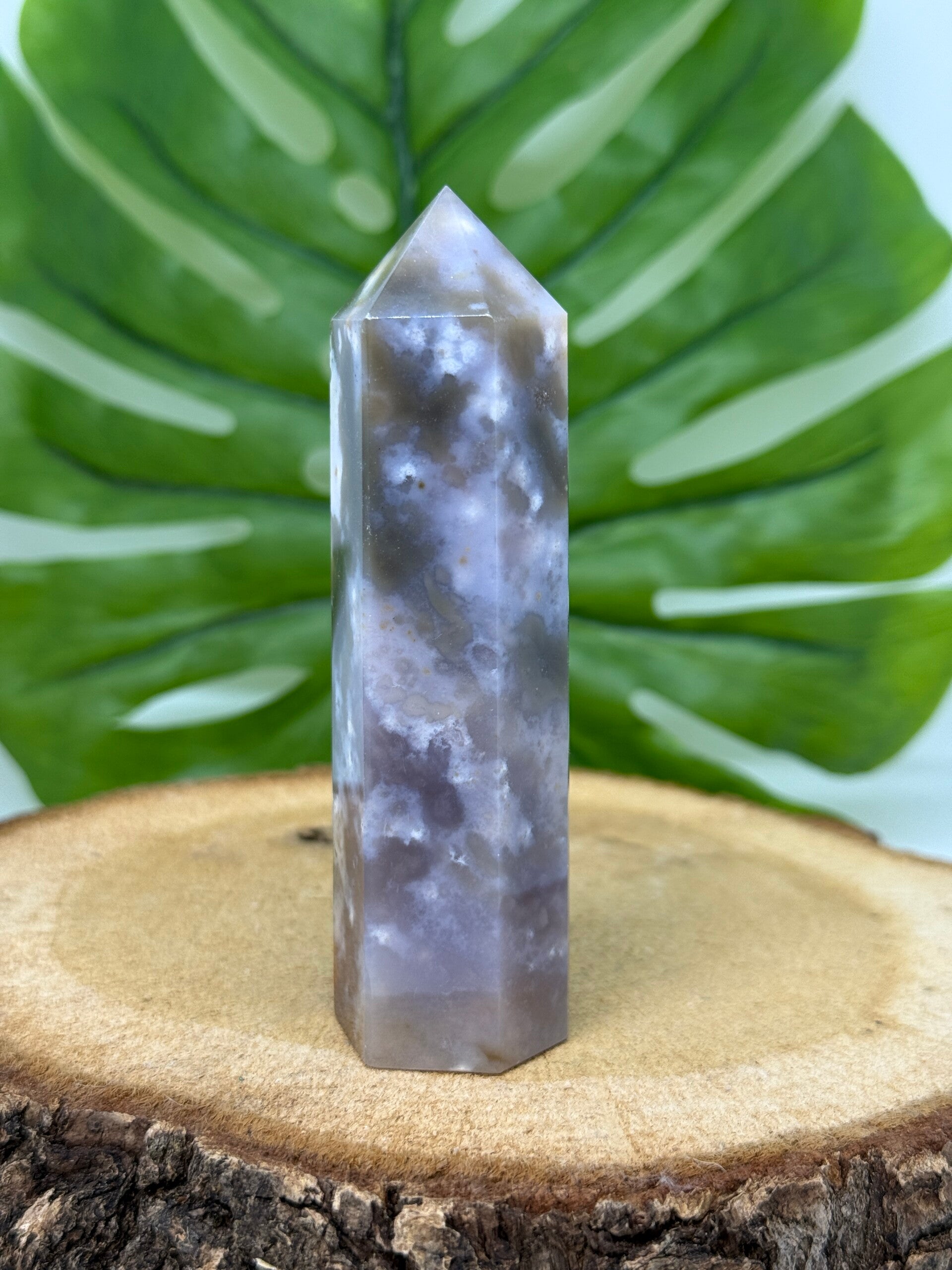 Punt van Oceaan Jaspis. 9,6 centimeter hoog en 107 gram. Je ontvangt de punt van de foto.