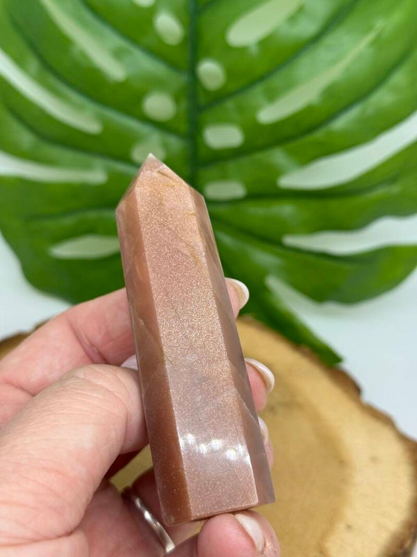 Perzik maansteen punt met zonnesteen toplaag. Tussen de 6 en 9 centimeter hoog. Willekeurig gekozen.