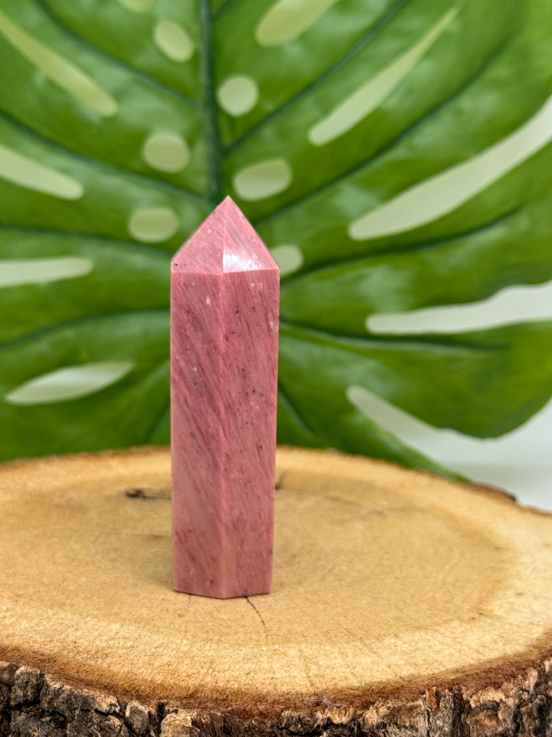 Roze versteend hout punt. Tussen de 7 en 8 centimeter hoog en willekeurig gekozen.
